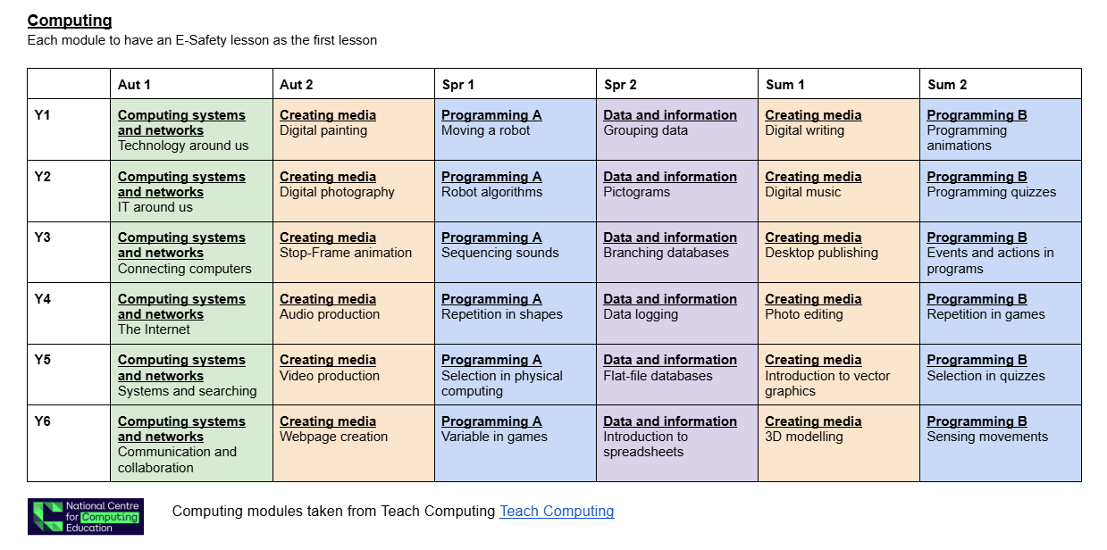 - Our computing curriculum is implemented through 6 week topics and is a learning journey with concepts which weave throughout the whole curriculum.